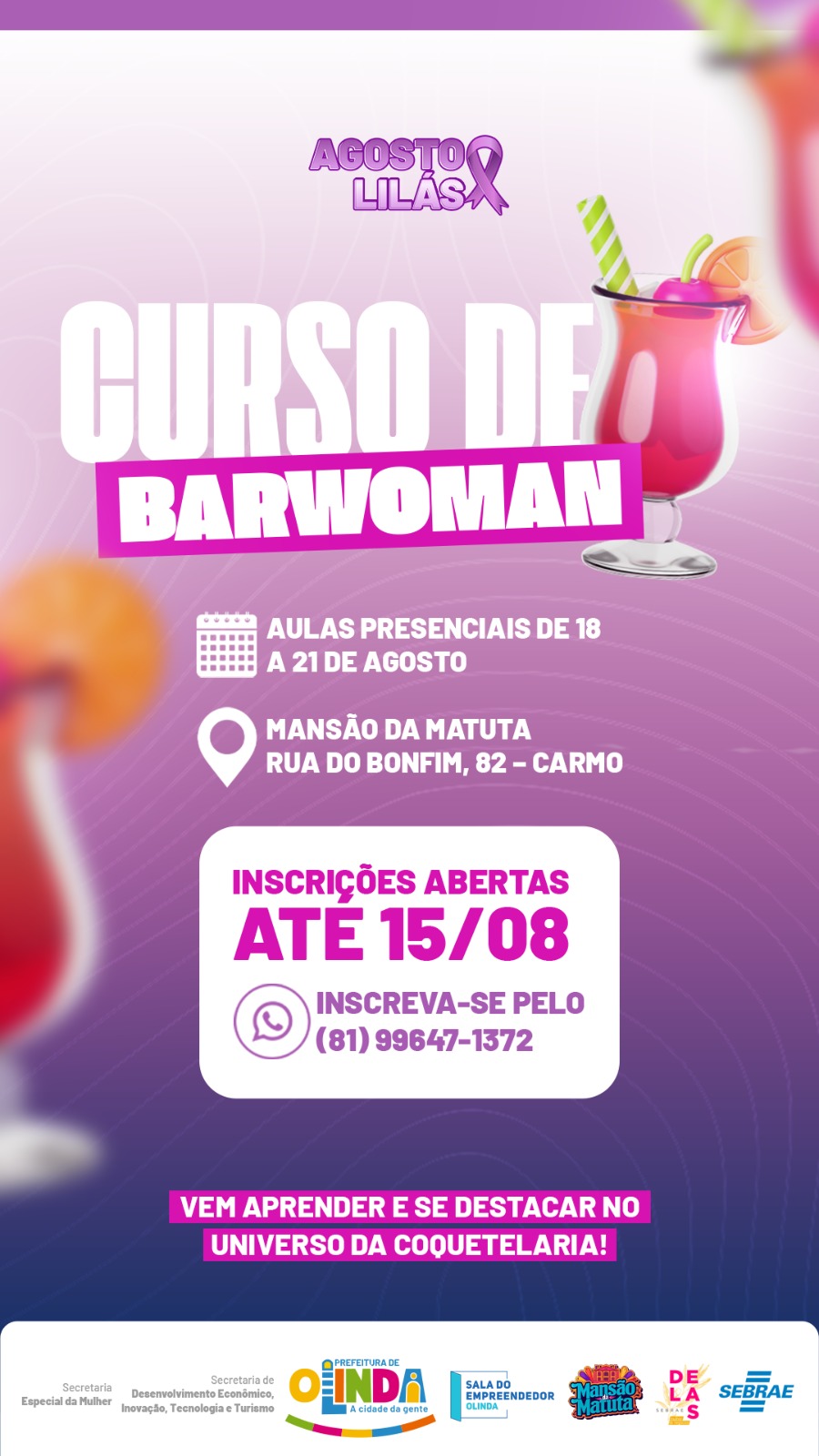 Dando continuidade às Ações do Agosto Lilás, a Prefeitura de Olinda, por meio da Secretaria Especial da Mulher, Secretaria de Desenvolvimento Econômico, Sala do Empreendedor de Olinda e SEBRAE Delas, está com inscrições abertas para o Curso de Barwoman. A formação é voltada exclusivamente para mulheres a partir de 18 anos, residentes no município.