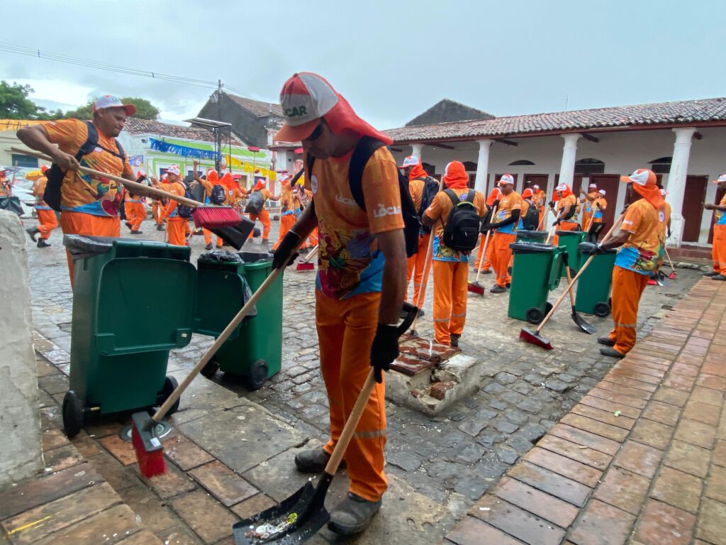A operação contou com cerca de 100 trabalhadores, além do apoio de um caminhão compactador, caminhão-pipa e varredeira mecânica, garantindo reforço na limpeza das principais vias do Sítio Histórico.