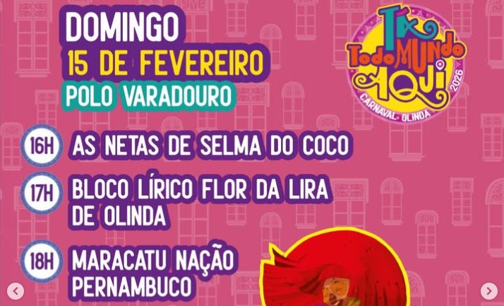 O Carnaval de Olinda 2026 conta com vários polos, como os da Praça do Carmo, de Rio Doce, do Guadalupe, de Peixinhos e do Varadouro. Este último terá shows das 16h às 22h, com coco, samba e maracatu. Confira, abaixo, os horários das atrações.