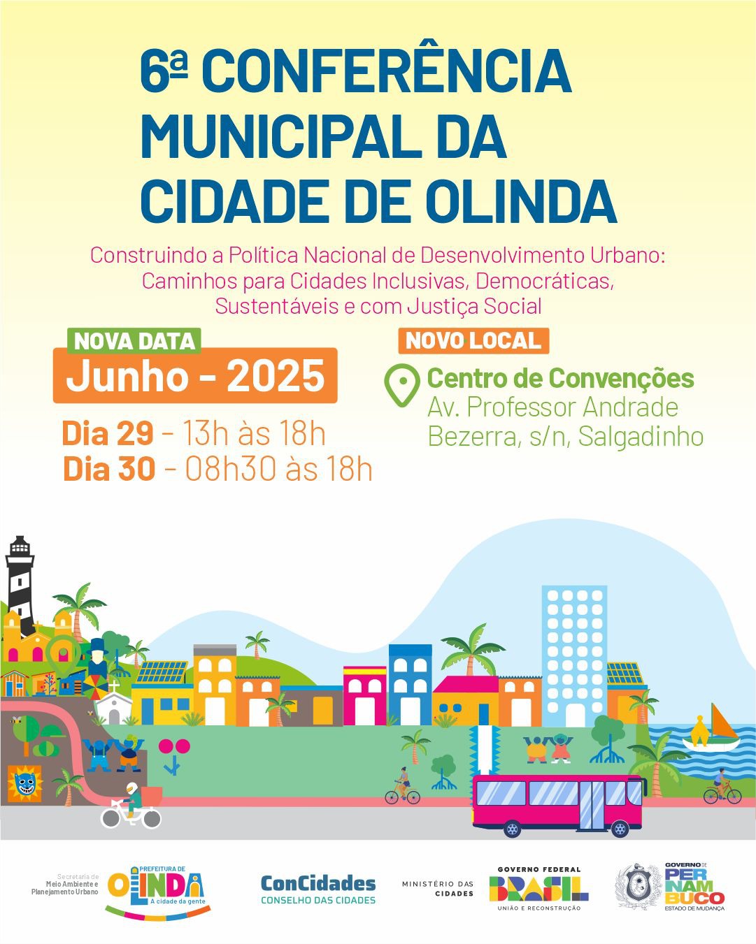 Devido à grande procura, a 6ª Conferência Municipal da Cidade de Olinda abrirá novas vagas para inscrições presenciais. Os interessados devem comparecer ao local do evento, das 12h às 14h, para realizar o credenciamento. A conferência será realizada nos dias 29 e 30 de junho de 2025, no Centro de Convenções de Pernambuco, em Salgadinho.