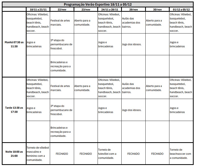 O Verão Esportivo oferece oficinas e competições de beach soccer, beach tênis, vôlei de praia, basquete, futvôlei, beach hand, além de jogos populares e atividades lúdicas para crianças e jovens. A arena instalada na orla conta com estrutura completa: quadras, materiais esportivos, equipe de educação física, suporte médico, coordenação e operação permanente.