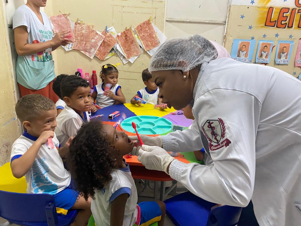 As profissionais também ensinaram técnicas de escovação e orientaram os pequenos sobre a importância do cuidado diário com os dentes.