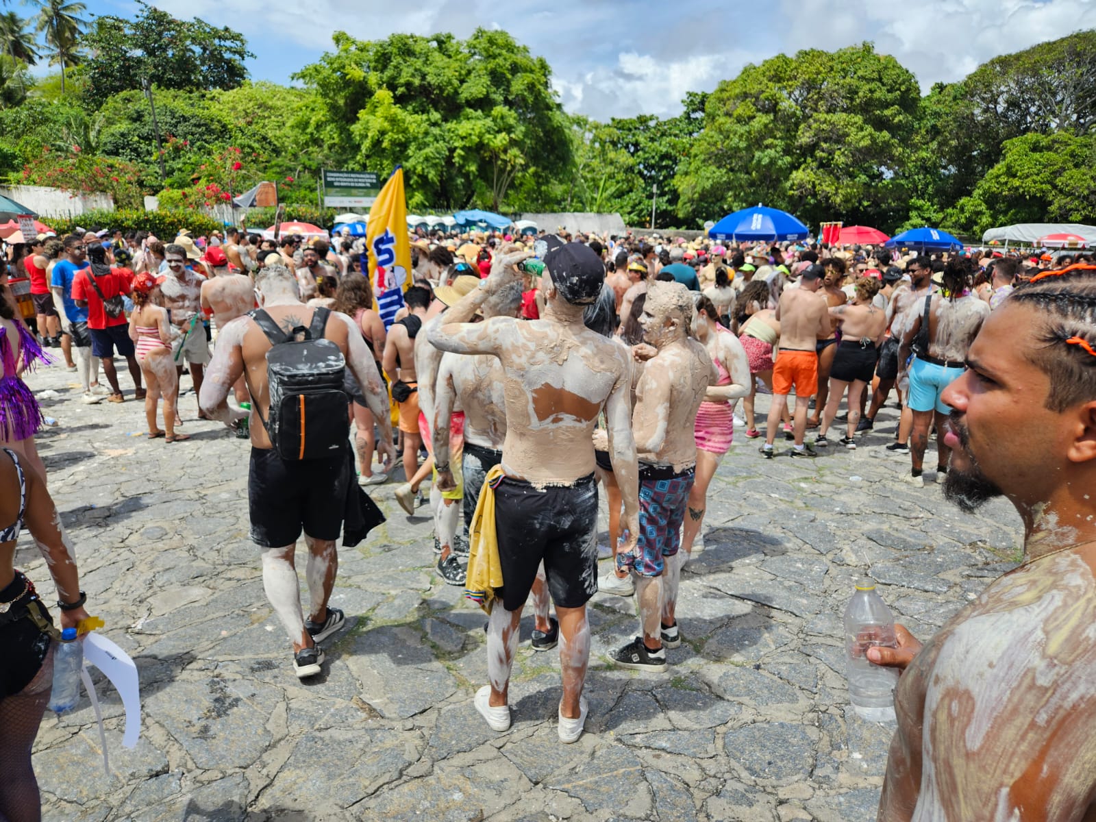 Muitos foliões fantasiados de caranguejo se reuniram em frente ao Mosteiro de São Bento, no Varadouro, e depois saíram em cortejo. Pessoas de todas as idades participaram do mela-mela com o astral lá em cima. A argila usada pelo bloco é denominada caulim – utilizada na fabricação de cosméticos, como: creme dental e desodorante. O produto também tem função terapêutica.