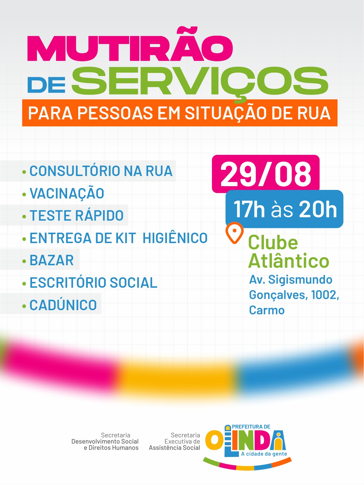 A Prefeitura de Olinda promove, nesta sexta-feira (29), um grande Mutirão de Serviços voltado para pessoas em situação de rua. A ação acontece das 17h às 20h, no Clube Atlântico, reunindo atendimentos de saúde, assistência social e atividades de inclusão.