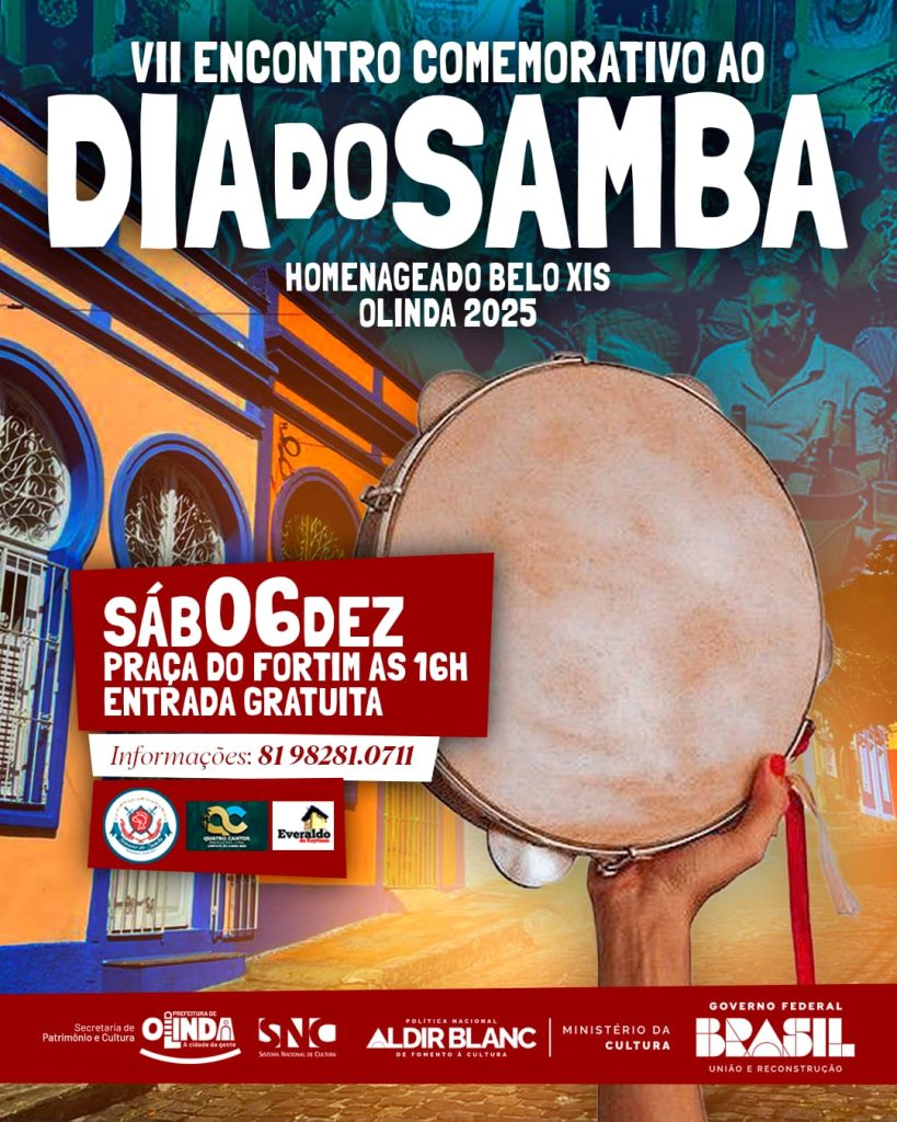 Olinda se prepara para mais uma tarde de samba e memória viva. A 7ª edição do Encontro Comemorativo ao Dia do Samba acontece neste sábado (6), a partir das 16h, na Praça do Fortim, reunindo artistas que mantêm a tradição do gênero pulsando no estado.