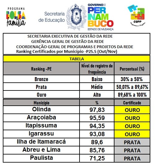 Olinda conquistou o Selo Ouro em Frequência Escolar do Programa Bolsa Família após registrar avanço no acompanhamento da presença de estudantes beneficiários da rede municipal. Nos meses de outubro e novembro de 2025, o município alcançou 97,83% de frequência escolar, superando o percentual de 92,43% registrado entre agosto e setembro do mesmo ano.
