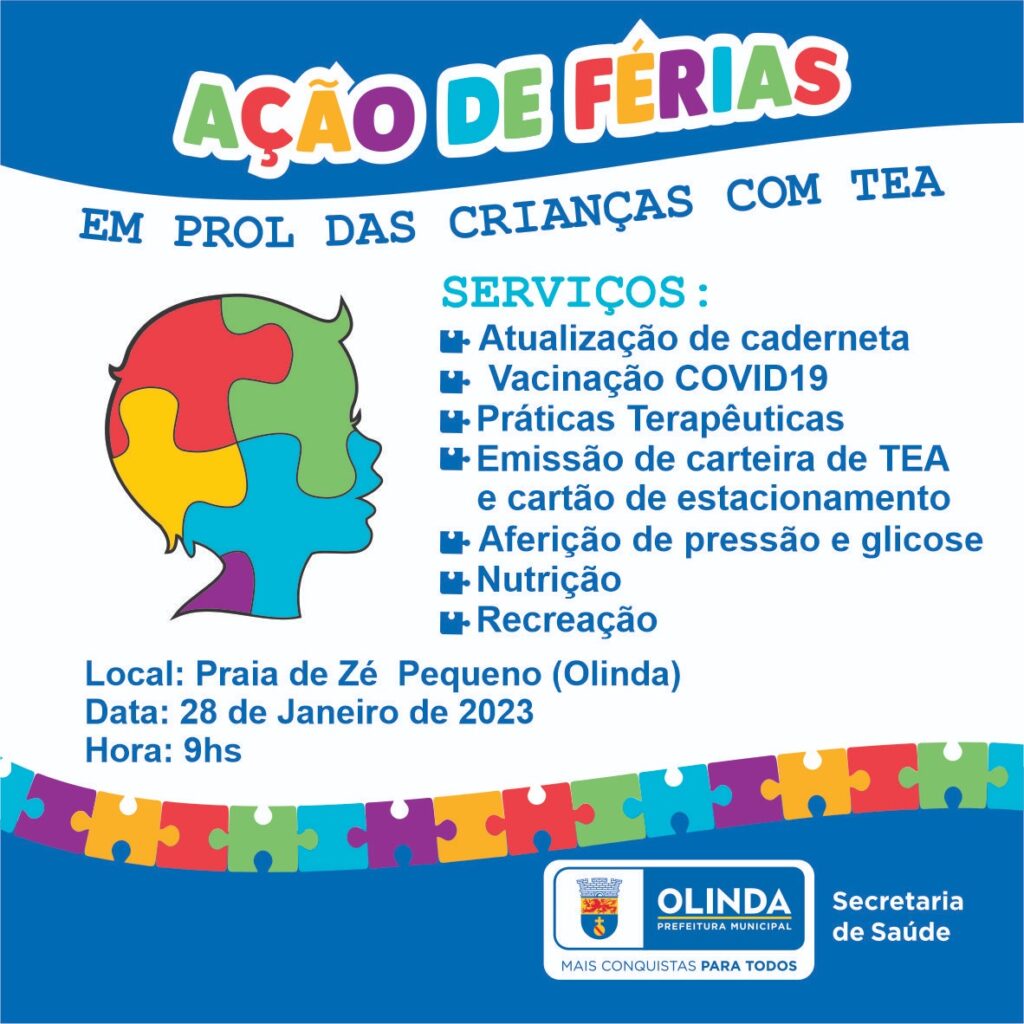 Neste sábado (28.1), Olinda promove uma ação de férias voltada para crianças com Transtorno do Espectro Autista (TEA). O evento será das 9h às 12h, na orla de Bairro Novo (Zé Pequeno), organizado pela Secretaria de Saúde da cidade, por meio da Diretoria de Políticas Estratégicas, através da Coordenação da Pessoa com Deficiência do município.