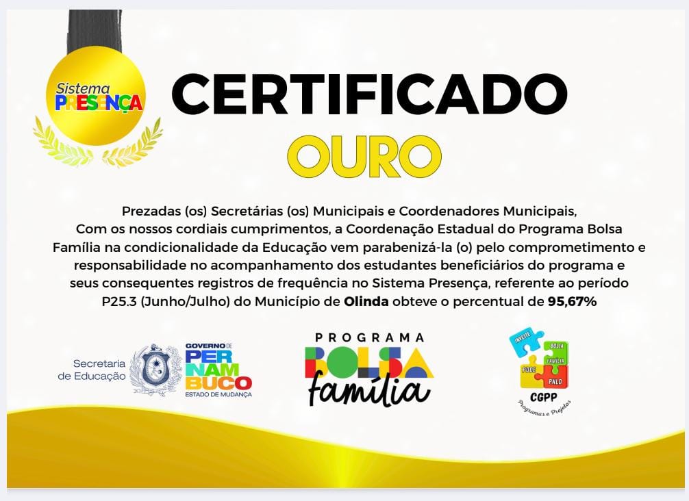 De acordo com o texto do certificado recebido por Olinda, “a Coordenação Estadual do Programa Bolsa Família, na condicionalidade da Educação, vem parabenizá-lo pelo comprometimento e responsabilidade no acompanhamento dos estudantes beneficiários do programa e seus consequentes registros de frequência no Sistema Presença, referente ao período de junho/julho do município de Olinda”.