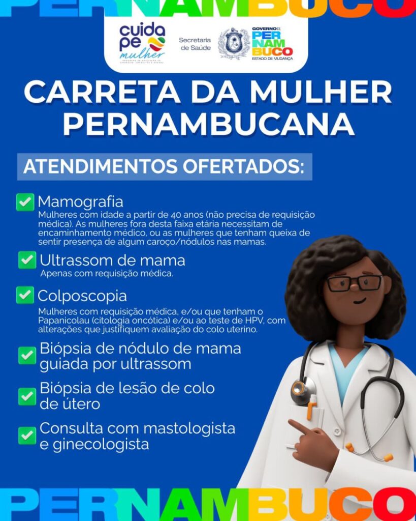 A Carreta da Mulher Pernambucana aporta mais uma vez em Olinda. Na manhã deste sábado (7), das 8h às 13h, a unidade móvel de saúde estará estacionada na rua Trinta e Oito, IV Etapa de Rio Doce.