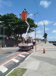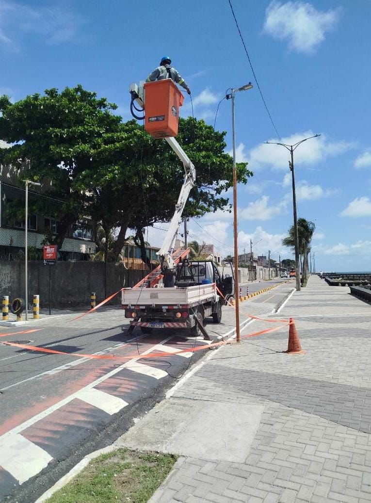 A Diretoria de Iluminação Pública da Secretaria de Gestão Urbana de Olinda segue, desde o início da semana, com os trabalhos de manutenção na orla da cidade. Equipes de manutenção se dividem no trecho que vai do Fortim do Queijo, no Bairro Novo, até Rio Doce, na área limite com a cidade do Paulista. Técnicos contam com o suporte de um caminhão munck na instalação de novos postes e substituição aos que apresentavam sinais de corrosão. A ação conta, ainda, com reparos em todo sistema elétrico e troca de lâmpadas.