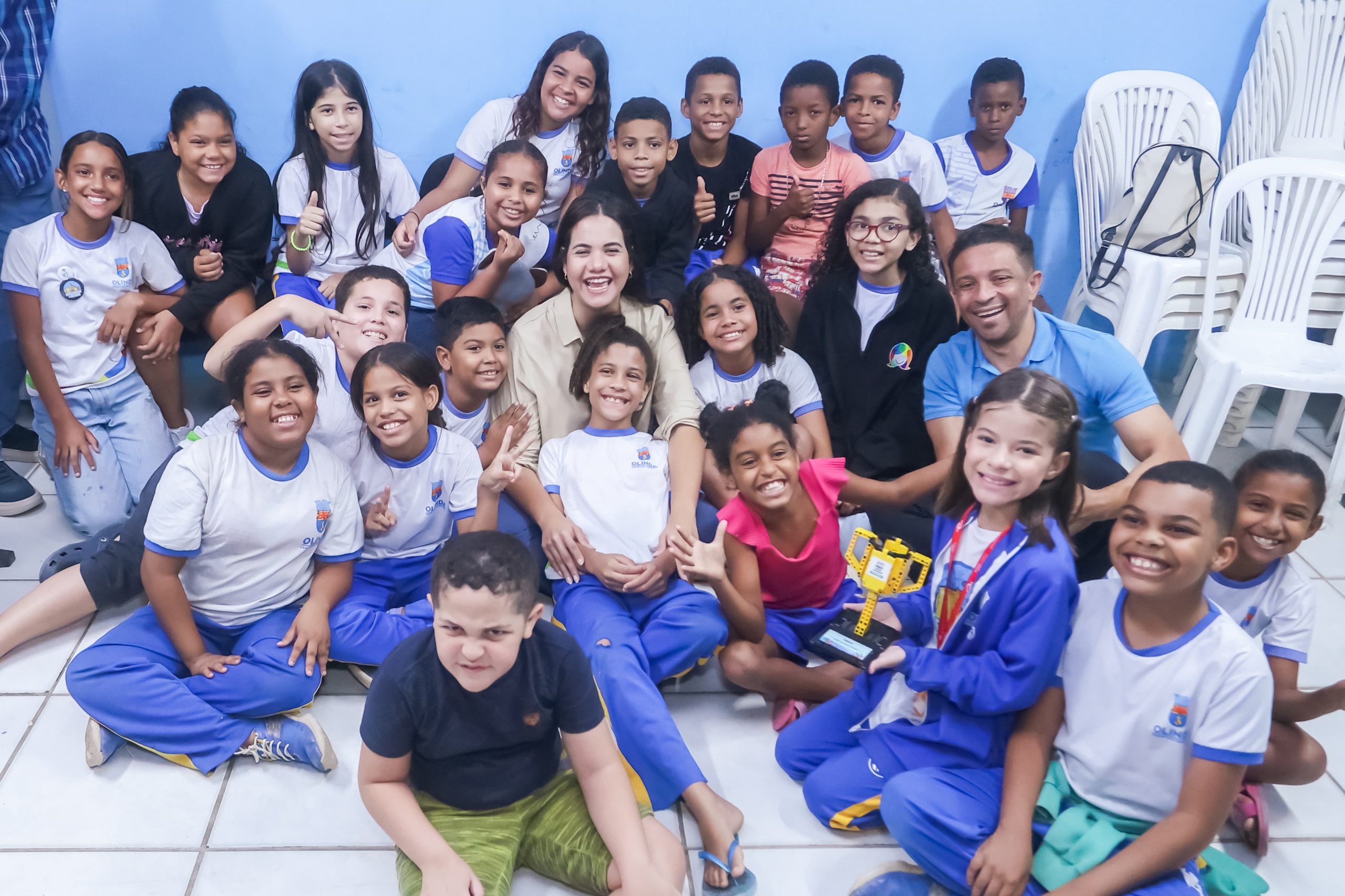 “Vim dar um abraço pessoalmente pela conquista do troféu no First Lego. A gente fica muito feliz com a felicidade de vocês. Que venham mais e mais competições para a gente colocar Olinda em destaque”, disse Mirella, após tocar nos troféus e medalhas dos campeões, os estudantes Wallas Flávio Caetano de Melo e Sophya Rafaela Santos da Silva.