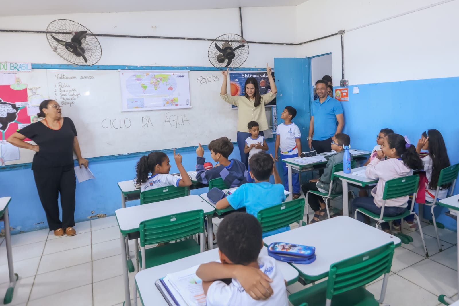 Além de conversar com os jovens vencedores do First Lego, Mirella Almeida aproveitou para fazer uma vistoria na Escola Dom João Crisóstomo. A prefeitura conversou com os professores e brincou com os demais alunos matriculados na unidade pública de ensino.