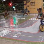 A Secretaria de Mobilidade de Olinda forneceu uma pista sinalizada, com semáforos e bicicletas, onde eles aprendem sobre as regras de direção e trânsito.